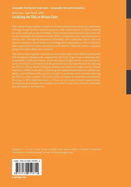 This volume brings together a unique set of interventions from a variety of contributors to bridge the gap between research and policy with a distinct focus on Africa, drawing on work conducted as part of multiple interconnected research projects and networks on the Sustainable Development Goals (SDGs) and global policy implementation in African cities. Through the framework of the SDGs, and in particular Goal 11, the book aims to contribute to generating new knowledge about approaches to SDG localization that are grounded in complex and diverse local contexts, needs and realities, integrated perspectives and collaborative research.