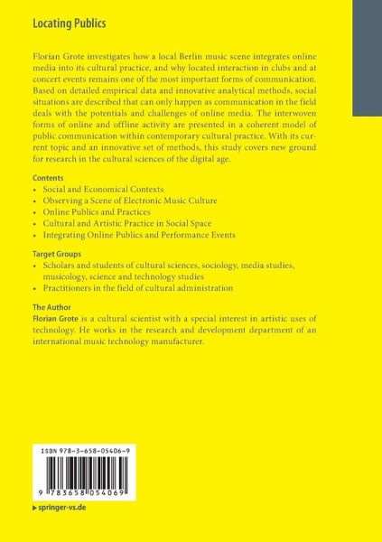 Florian Grote investigates how a local Berlin music scene integrates online media into its cultural practice and why located interaction in clubs and at concert events remains one of the most important forms of communication. Based on detailed empirical data and innovative analytical methods, social situations are described that can only happen as communication in the field deals with the potentials and challenges of online media. The interwoven forms of online and offline activity are presented in a coherent model of public communication within contemporary cultural practice. With its current topic and an innovative set of methods, this study covers new ground for research in the cultural sciences of the digital age.