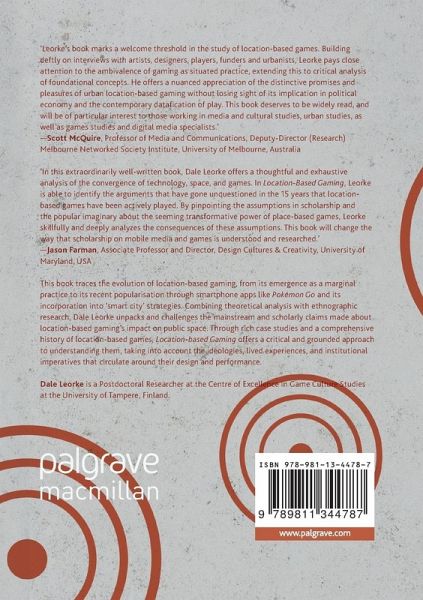 Location-based games emerged in the early 2000s following the commercialisation of GPS and artistic experimentation with 'locative media' technologies. Location-based games are played in everyday public spaces using GPS and networked, mobile technologies to track their players' location. This book traces the evolution of location-based gaming, from its emergence as a marginal practice to its recent popularisation through smartphone apps like Pokémon Go and its incorporation into 'smart city' strategies. Drawing on this history and an analysis of the scholarly and mainstream literature on location-based games, Leorke unpacks the key claims made about them. These claims position location-based games as alternately enriching or diminishing their players' engagement with the people and places they encounter through the game. Through rich case studies and interviews with location-based game designers and players, Leorke tests out and challenges these celebratory and pessimistic discourses. He argues for a more grounded approach to researching location-based games and their impact on public space that reflects the ideologies, lived experiences, and institutional imperatives that circulate around their design and performance. By situating location-based games within broader debates about the role of play and digitisation in public life, Location-Based Gaming offers an original and timely account of location-based gaming and its growing prominence.