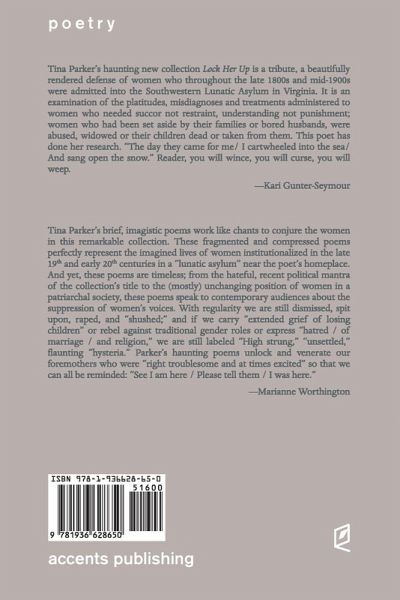 "Tina Parker's haunting new collection Lock Her Up is a tribute, a beautifully rendered defense of women who throughout the late 1800s and mid-1900s were admitted into the Southwestern Lunatic Asylum in Virginia. It is an examination of the platitudes, misdiagnoses and treatments administered to women who needed succor not restraint, understanding not punishment; women who had been set aside by their families or bored husbands, were abused, widowed or their children dead or taken from them. This poet has done her research. "The day they came for me/ I cartwheeled into the sea/ And sang open the snow." Reader, you will wince, you will curse, you will weep." -Kari Gunter-Seymour