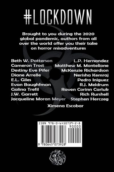 Horror stories for LOCKDOWN FEATURED AUTHORS House Arrest by Beth W. Patterson Hoffman's Creeper by Cameron Trost The Demon Cat by Destiny Eve Pifer A Man Walked into A Bar And Said... by Diane Arrelle The Last Tango by E.L. Giles Bring Him Back by Evan Baughfman In Muck and Mire by Galina Trefil Silence Finds Me by J.W. Garrett The Hunting Cabin by Jacqueline Moran Meyer A Taste for Flesh by L.P. Hernandez Revolutionary Hunger by Matthew M. Montelione The Jar by McKenzie Richardson The Harvest by Nerisha Kemraj The Tempest on the Pier by Pedro Iniguez New World by R.J. Meldrum The Raven's Revenge by Raven Corinn Carluk Beyond the Juniper Grove by Rich Rurshell An Eternity Together by Stephen Herczeg Taken by Ximena Escobar