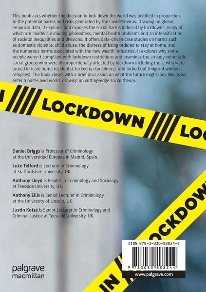 0. Foreword: Emeritus Professor Robert Dingwall. 1. Conceptualising Covid-19 Times: Post-Politics And Social Harm- 2. To Lockdown Or Not To Lockdown? That Is The Question.- 3. Illness And Death In The Covid Epoch.- 4. Lockdown Inequalities: Covid-19 Losers.- 5. Pandemic Winners: Unlocking The Wealth Industries.- 6. Locked Down: Western Society.- 7. Locked In: The Elderly And Vulnerable.- 8. Locked Up: Prisoners, Youth Detainees And Asylum Seekers.- 9. Locked Out: Migrant Workers, Refugees, Stateless Citizens And The Homeless.- 10. The Dichotomy Of Lockdowns: Covid Compliance And Restriction Refusal.- 11. The Ideological Residue From Lockdowns.- 12. Endgames.