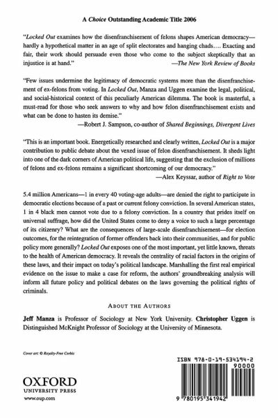 Locked Out exposes felon disenfranchisement as one of the most important, yet little known, threats to the health of American democracy today. It reveals the centrality of racial factors in the origins of these laws, and their impact on politics, election outcomes, and public policy. Marshalling the first real empirical evidence on the issue to make a case for reform, the authors' path-breaking analysis will inform all future policy and political debates on the lawsgoverning the political rights of criminals.