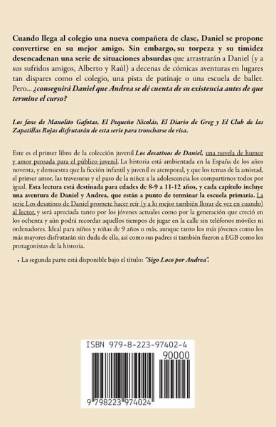 Cuando llega al colegio una nueva compañera de clase, Daniel se propone convertirse en su mejor amigo. Sin embargo, su torpeza y su timidez desencadenan una serie de situaciones absurdas que arrastrarán a Daniel (y a sus sufridos amigos, Alberto y Raúl) a decenas de cómicas aventuras en lugares tan dispares como el colegio, una pista de patinaje o una escuela de ballet. Pero... ¿conseguirá Daniel que Andrea se dé cuenta de su existencia antes de que termine el curso? Los fans de Manolito Gafotas, El Pequeño Nicolás, El Diario de Greg y El Club de las Zapatillas Rojas disfrutarán de esta serie para troncharse de risa. Este es el primer libro de la colección juvenil Los desatinos de Daniel, una novela de humor y amor pensada para el público juvenil. La historia está ambientada en la España de los años noventa, y demuestra que la ficción infantil y juvenil es atemporal, y que los temas de la amistad, el primer amor, las travesuras y el paso de la niñez a la adolescencia los compartimos todos por igual. Esta lectura está destinada para edades de 8-9 a 11-12 años, y cada capítulo incluye una aventura de Daniel y Andrea, que están a punto de terminar la escuela primaria. La serie Los desatinos de Daniel promete hacer reír (y a lo mejor también llorar de vez en cuando) al lector, y será apreciada tanto por los jóvenes actuales como por la generación que creció en los ochenta y aún podrá recordar aquellos tiempos de jugar en la calle sin teléfonos móviles ni ordenadores. Ideal para niños y niñas de 9 años o más, aunque tanto los más jóvenes como los más mayores disfrutarán sin duda de ella, así como sus padres si también fueron a EGB como los protagonistas de la historia.La segunda parte está disponible bajo el título: "Sigo Loco por Andrea".