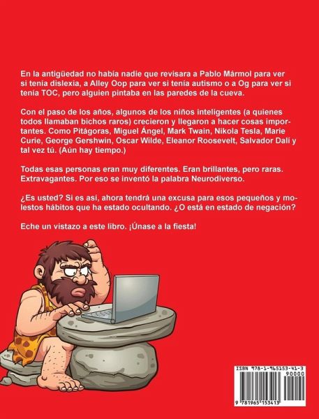En la antigüedad no había nadie que revisara a Pablo Mármol para ver si tenía dislexia, a Alley Oop para ver si tenía autismo o a Og para ver si tenía TOC, pero alguien pintaba en las paredes de la cueva. Con el paso de los años, algunos de los niños inteligentes (a quienes todos llamaban bichos raros) crecieron y llegaron a hacer cosas importantes. Como Pitágoras, Miguel Ángel, Mark Twain, Nikola Tesla, Marie Curie, George Gershwin, Oscar Wilde, Eleanor Roosevelt, Salvador Dalí y tal vez tú. (Aún hay tiempo.) Todas esas personas eran muy diferentes. Eran brillantes, pero raras. Extravagantes. Por eso se inventó la palabra Neurodiverso. ¿Es usted? Si es así, ahora tendrá una excusa para esos pequeños y molestos hábitos que ha estado ocultando. ¿O está en estado de negación? Eche un vistazo a este libro. ¡Únase a la fiesta! Back in antiquity there was no one to check Barney Rubble for dyslexia or Alley Oop for autism or Og for OCD, but somebody was painting on the walls of the cave. Over the years, some of the smart kids (who everyone called weirdos) grew up to do important things. Like Pythagoras, Michelangelo, Mark Twain, Nikola Tesla, Marie Curie, George Gershwin, Oscar Wilde, Eleanor Roosevelt, Salvadore Dali, and maybe you. (There's still time.) Those folks were all very different. They were brilliant, yet odd. Quirky. So the word Neurodiverse was invented. Is that you? If so, now you'll have an excuse for those annoying little habits you've been hiding. Or are you in denial? Check out this book. Join the party!