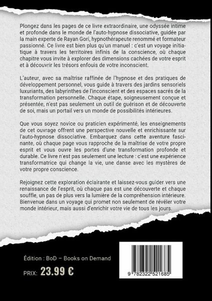 Plongez dans les pages de ce livre extraordinaire, une odyssée intime et profonde dans le monde de l'auto-hypnose dissociative, guidée par la main experte de Rayan Gori, hypnothérapeute renommé et formateur passionné. Ce livre est bien plus qu'un manuel : c'est un voyage initiatique à travers les territoires infinis de la conscience, où chaque chapitre vous invite à explorer des dimensions cachées de votre esprit et à découvrir les trésors enfouis de votre inconscient.L'auteur, avec sa maîtrise raffinée de l'hypnose et des pratiques de développement personnel, vous guide à travers des jardins sensoriels luxuriants, des labyrinthes de l'inconscient et des espaces sacrés de la transformation personnelle. Chaque étape, soigneusement conçue et présentée, n'est pas seulement un outil de guérison et de découverte de soi, mais un portail vers un monde de possibilités intérieures.Que vous soyez novice ou praticien expérimenté, les enseignements de cet ouvrage offrent une perspective nouvelle et enrichissante sur l'auto-hypnose dissociative. Embarquez dans cette aventure fascinante, où chaque page vous rapproche de la maîtrise de votre propre esprit et vous ouvre les portes d'une transformation profonde et durable. Ce livre n'est pas seulement une lecture : c'est une expérience transformatrice qui change la vie, une danse avec les mystères de votre propre conscience. Rejoignez cette exploration éclairante et laissez-vous guider vers une renaissance de l'esprit, où chaque pas est une découverte et chaque souffle, un pas de plus vers la lumière de la compréhension intérieure. Bienvenue dans un voyage qui promet non seulement de révéler votre monde intérieur, mais aussi d'enrichir votre vie de tous les jours.
