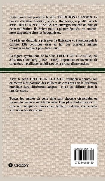 Cette uvre (édition relié) fait partie de la série TREDITION CLASSICS. La maison d édition tredition, basée à Hambourg, a publié dans la série TREDITION CLASSICS des ouvrages anciens de plus de deux millénaires. Ils étaient pour la plupart épuisés ou uniquement disponible chez les bouquinistes. La série est destinée à préserver la littérature et à promouvoir la culture. Avec sa série TREDITION CLASSICS, tredition à comme but de mettre à disposition des milliers de classiques de la littérature mondiale dans différentes langues et de les diffuser dans le monde entier.