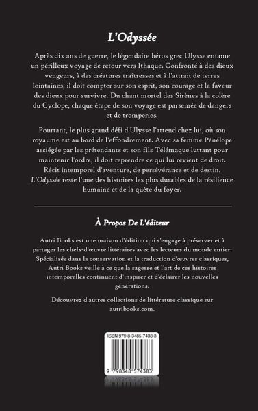 Voyage épique d'héroïsme et d'endurance, l'Odyssée raconte le périlleux retour d'Ulysse chez lui après la guerre de Troie, rencontrant en chemin des dieux, des monstres et des épreuves qui changent le cours du destin.