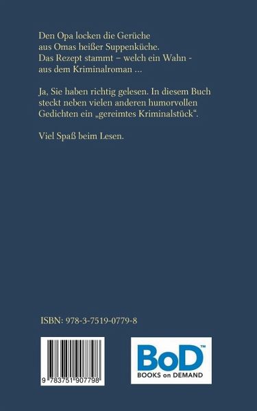 In diesem Buch finden Sie Wortspiele und Wortwitz in Reimen, mit denen ich schon auf vielen Bühnen (Comedy, Poetry Slam oder Lesung) die Lachmuskeln meiner Zuhörer in Bewegung bringen konnte.Dafür wurden meine Gedichtbände 'Wortspielereimen" und "Elefantenquantensprung" gründlich überarbeitet. Stammt Omas Suppenrezept wirklich aus einem Kriminalroman? Diese Frage wird in einem Kriminal-Gedicht geklärt. In weiteren Reimen erfahren Sie mehr über Hochstapler oder über das Computerprogramm "Mikroweich-Fenster".