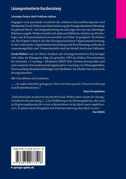 Engagiert und praxisnah vermittelt die erfahrene Kurzzeittherapeutin und Mediatorin Ursula Wolters das Handwerkszeug der lösungsorientierten Beratung. Sie geht auf Einzel- wie Gruppenberatung ein und zeigt , wie man mit schwierigen Klienten umgeht. Wolters bezieht sich dabei auf hilfreiche Ansätze aus Psychologie und Kommunikationswissenschaft und führt in geeignete Techniken ein. Ein Kapitel widmet sich der lösungsorientierten Organisationsberatung, in der systemische Organisationsentwicklung und Kurzberatung methodisch zusammengeführt sind. Veranschaulicht wird das Modell durch eine Fallstudie.