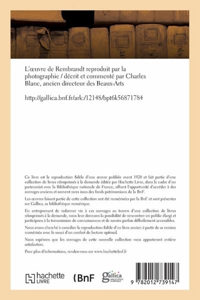 L'oeuvre de Rembrandt reproduit par la photographie / décrit et commenté par Charles Blanc, ancien directeur des Beaux-Arts Date de l'édition originale: 1853-1858 Sujet de l'ouvrage: Rembrandt (1606-1669) -- Oeuvres -- Gravure -- Photographies Le présent ouvrage s'inscrit dans une politique de conservation patrimoniale des ouvrages de la littérature Française mise en place avec la BNF. HACHETTE LIVRE et la BNF proposent ainsi un catalogue de titres indisponibles, la BNF ayant numérisé ces oeuvres et HACHETTE LIVRE les imprimant à la demande. Certains de ces ouvrages reflètent des courants de pensée caractéristiques de leur époque, mais qui seraient aujourd'hui jugés condamnables. Ils n'en appartiennent pas moins à l'histoire des idées en France et sont susceptibles de présenter un intérêt scientifique ou historique. Le sens de notre démarche éditoriale consiste ainsi à permettre l'accès à ces oeuvres sans pour autant que nous en cautionnions en aucune façon le contenu. Pour plus d'informations, rendez-vous sur www.hachettebnf.fr