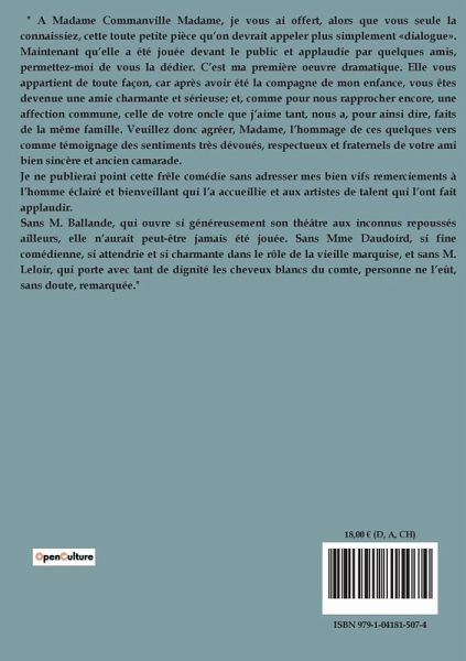 " A Madame Commanville Madame, je vous ai offert, alors que vous seule la connaissiez, cette toute petite pièce qüon devrait appeler plus simplement «dialogue». Maintenant qüelle a été jouée devant le public et applaudie par quelques amis, permettez-moi de vous la dédier. C¿est ma première oeuvre dramatique. Elle vous appartient de toute façon, car après avoir été la compagne de mon enfance, vous êtes devenue une amie charmante et sérieuse; et, comme pour nous rapprocher encore, une affection commune, celle de votre oncle que j¿aime tant, nous a, pour ainsi dire, faits de la même famille. Veuillez donc agréer, Madame, l¿hommage de ces quelques vers comme témoignage des sentiments très dévoués, respectueux et fraternels de votre ami bien sincère et ancien camarade. Je ne publierai point cette frêle comédie sans adresser mes bien vifs remerciements à l¿homme éclairé et bienveillant qui l¿a accueillie et aux artistes de talent qui l¿ont fait applaudir. Sans M. Ballande, qui ouvre si généreusement son théâtre aux inconnus repoussés ailleurs, elle n¿aurait peut-être jamais été jouée. Sans Mme Daudoird, si fine comédienne, si attendrie et si charmante dans le rôle de la vieille marquise, et sans M. Leloir, qui porte avec tant de dignité les cheveux blancs du comte, personne ne l¿eût, sans doute, remarquée."
