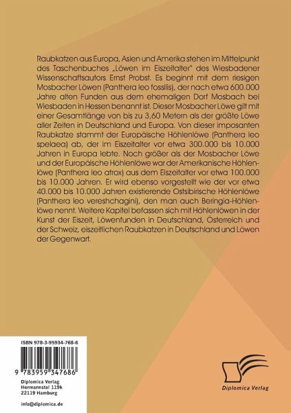 Raubkatzen aus Europa, Asien und Amerika stehen im Mittelpunkt des Taschenbuches "Löwen im Eiszeitalter" des Wiesbadener Wissenschaftsautors Ernst Probst. Es beginnt mit dem riesigen Mosbacher Löwen (Panthera leo fossilis), der durch etwa 600.000 Jahre alte Funden aus dem ehemaligen Dorf Mosbach bei Wiesbaden in Hessen benannt ist. Dieser Mosbacher Löwe gilt mit einer Gesamtlänge von bis zu 3,60 Metern als der größte Löwe aller Zeiten in Deutschland und Europa. Von dieser imposanten Raubkatze stammt der Europäische Höhlenlöwe (Panthera leo spelaea) ab, der im Eiszeitalter vor etwa 300.000 bis 10.000 Jahren in Europa lebte. Noch größer als der Mosbacher Löwe und der Europäische Höhlenlöwe war der Amerikanische Höhlenlöwe (Panthera leo atrox) aus dem Eiszeitalter vor etwa 100.000 bis 10.000 Jahren. Er wird ebenso vorgestellt wie der vor etwa 40.000 bis 10.000 Jahren existierende Ostsibirische Höhlenlöwe (Panthera leo vereshchagini), den man auch Beringia-Höhlenlöwe nennt. Weitere Kapitel befassen sich mit Höhlenlöwen in der Kunst der Eiszeit, Löwenfunden in Deutschland, Österreich und der Schweiz, eiszeitlichen Raubkatzen in Deutschland und Löwen der Gegenwart.