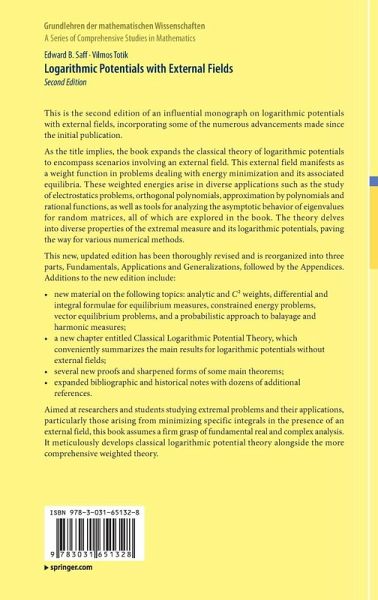 new material on the following topics: analytic and C² weights, differential and integral formulae for equilibrium measures, constrained energy problems, vector equilibrium problems, and a probabilistic approach to balayage and harmonic measures;a new chapter entitled Classical Logarithmic Potential Theory, which conveniently summarizes the main results for logarithmic potentials without external fields;several new proofs and sharpened forms of some main theorems;expanded bibliographic and historical notes with dozens of additional references.