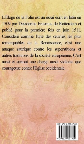 L'Éloge de la Folie est un essai écrit en latin en 1509 par Desiderius Erasmus de Rotterdam et publié pour la première fois en juin 1511. Considéré comme l'une des œuvres les plus remarquables de la Renaissance, c'est une attaque satirique contre les superstitions et autres traditions de la société européenne. C'est aussi et surtout une charge aussi violente que courageuse contre l'Église occidentale.