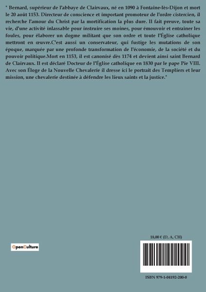 " Bernard, supérieur de l'abbaye de Clairvaux, né en 1090 à Fontaine-lès-Dijon et mort le 20 août 1153. Directeur de conscience et important promoteur de l'ordre cistercien, il recherche l'amour du Christ par la mortification la plus dure. Il fait preuve, toute sa vie, d'une activité inlassable pour instruire ses moines, pour émouvoir et entraîner les foules, pour élaborer un dogme militant que son ordre et toute l'Église catholique mettront en ¿uvre.C'est aussi un conservateur, qui fustige les mutations de son époque, marquée par une profonde transformation de l'économie, de la société et du pouvoir politique.Mort en 1153, il est canonisé dès 1174 et devient ainsi saint Bernard de Clairvaux. Il est déclaré Docteur de l'Église catholique en 1830 par le pape Pie VIII. Avec son Éloge de la Nouvelle Chevalerie il dresse ici le portrait des Templiers et leur mission, une chevalerie destinée à défendre les lieux saints et la justice."