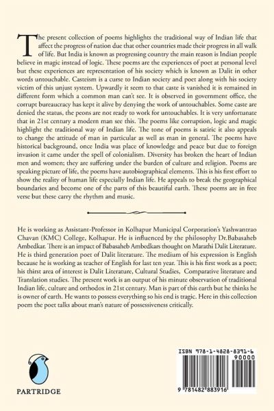 He is working as an assistant professor in Kolhapur Municipal Corporation's Yashwantrao Chavan (KMC) College, Kolhapur. He is influenced by the philosophy Dr Babasaheb Ambedkar. There is an impact of Babasaheb Ambedkar's thought on Marathi Dalit literature. He is a third-generation poet of Dalit literature. The medium of his expression is English because he has been working as a teacher of English for the last ten years. This is his first work as a poet; his thirst area of interest is Dalit literature, cultural studies, comparative literature, and translation studies. The present work is an output of his minute observations of traditional Indian life, culture, and orthodox in twenty-first century. Man is part of this earth, but he thinks he is the owner of the earth. He wants to possess everything, so his end is tragic. Here in this collection of poems, the poet critically talks about man's nature of possessiveness.