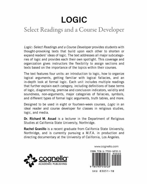 Logic: Select Readings and a Course Developer provides students with thought-provoking texts that build upon each other to shorten or expand readers' ideas of logic. The text addresses all major subcategories of logic and provides each their own spotlight. This coverage and organization gives instructors the flexibility to assign sections and texts based on the importance of the topics within their courses. The text features four units: an introduction to logic, how to organize logical arguments, getting familiar with logical fallacies, and an in-depth look at formal logic. Each unit includes multiple readings that further explain each category, including definitions of base terms of logic, diagramming, premise and conclusion indicators, validity and soundness, non-arguments, major categories of fallacies, symbols, and different types of formal logic arguments, truth tables, and more. Designed to be used in eight or fourteen-week courses, Logic in an ideal reader and course developer for classes in religious studies, logic, and media. Dr. Richard M. Assad is a lecturer in the Department of Religious Studies at California State University, Northridge. Rachel Granillo is a recent graduate from California State University, Northridge, and is currently pursuing a M.F.A. in production and directing documentary at the University of California, Los Angeles.