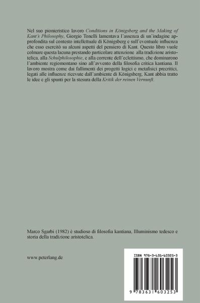 Nel suo pionieristico lavoro Conditions in Königsberg and the Making of Kant¿s Philosophy, Giorgio Tonelli lamentava l¿assenza di un¿indagine approfondita sul contesto intellettuale di Königsberg e sull¿eventuale influenza che esso esercitò su alcuni aspetti del pensiero di Kant. Questo libro vuole colmare questa lacuna prestando particolare attenzione alla tradizione aristotelica, alla Schulphilosophie, e alla corrente dell¿eclettismo, che dominarono l¿ambiente regiomontano sino all¿avvento della filosofia critica kantiana. Il lavoro mostra come dai fallimenti dei progetti logici e metafisici precritici, legati alle influenze ricevute dall¿ambiente di Königsberg, Kant abbia tratto le idee e gli spunti per la stesura della Kritik der reinen Vernunft.