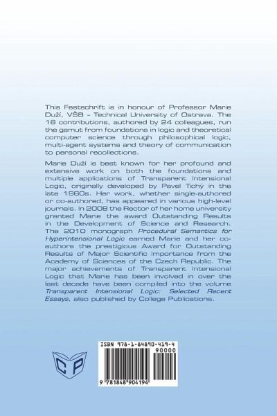 This Festschrift is in honour of Professor Marie Düí, V¿B - Technical University of Ostrava. The 16 contributions, authored by 24 colleagues, run the gamut from foundations in logic and theoretical computer science through philosophical logic, multi-agent systems and theory of communication to personal recollections. Marie Düí is best known for her profound and extensive work on both the foundations and multiple applications of Transparent Intensional Logic, originally developed by Pavel Tichý in the late 1960s. Her work, whether single-authored or co-authored, has appeared in various high-level journals. In 2008 the Rector of her home university granted Marie the award Outstanding Results in the Development of Science and Research. The 2010 monograph Procedural Semantics for Hyperintensional Logic earned Marie and her coauthors the prestigious Award for Outstanding Results of Major Scientific Importance from the Academy of Sciences of the Czech Republic. The major achievements of Transparent Intensional Logic that Marie has been involved in over the last decade have been compiled into the volume Transparent Intensional Logic: Selected Recent Essays, also published by College Publications.