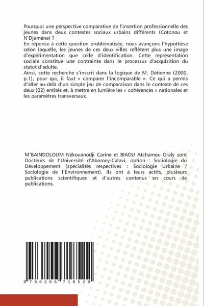 Pourquoi une perspective comparative de l'insertion professionnelle des jeunes dans deux contextes sociaux urbains différents (Cotonou et N'Djaména) ?En réponse à cette question problématisée, nous avançons l'hypothèse selon laquelle, les jeunes de ces deux villes reflètent plus une image d'expérimentation que celle d'identification. Cette représentation sociale constitue une contrainte dans le processus d'acquisition du statut d'adulte.Ainsi, cette recherche s'inscrit dans la logique de M. Détienne (2000, p.1), pour qui, il faut « comparer l'incomparable ». Ce qui a permis d'aller au-delà d'un simple jeu de comparaison dans le contexte de ces deux (02) entités et, à mettre en lumière les « cohérences » nationales et les paramètres transversaux.