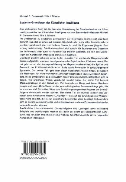 1 Einführung.- 1.1 Literatur und historische Bemerkungen.- Übungen.- 2 Deklaratives Wissen.- 2.1 Konzeptualisierung.- 2.2 Der Prädikatenkalkül.- 2.3 Semantik.- 2.4 Ein Beispiel aus der Klötzchenwelt.- 2.5 Ein Beispiel aus der Welt der Schaltkreise.- 2.6 Beispiele aus der Welt der Algebra.- 2.7 Beispiele aus der Welt der Listen.- 2.8 Beispiele aus der Welt der natürlichen Sprache.- 2.9 Spezielle Sprachen.- 2.10 Literatur und historische Bemerkungen.- Übungen.- 3 Inferenz.- 3.1 Ableitbarkeit.- 3.2 Inferenzprozeduren.- 3.3 Logische Implikation.- 3.4 Beweisbarkeit.- 3.5 Das Beweisen der Beweisbarkeit.- 3.6 Literatur und historische Bemerkungen.- Übungen.- 4 Resolution.- 4.1 Klauselform.- 4.2 Unifikation.- 4.3 Das Resolutionsprinzip.- 4.4 Resolution.- 4.5 Unerfüllbarkeit.- 4.6 Wahr/Falsch-Fragen.- 4.7 Einsetzungsfragen.- 4.8 Beispiele aus der Welt der Schaltkreise.- 4.9 Beispiele aus der Welt der Mathematik.- 4.10 Konsistenz und Vollständigkeit.- 4.11 Resolution und Gleichheit.- 4.12 Literatur und historische Bemerkungen.- Übungen.- 5 Resolutionsstrategien.- 5.1 Eliminationsstrategien.- 5.2 Die Unit-Resolution.- 5.3 Die Eingabe-Resolution.- 5.4 Lineare Resolution.- 5.5 Stützmengenresolution.- 5.6 Geordnete Resolution.- 5.7 Gerichtete Resolution.- 5.8 Die sequentielle Erfüllung von Randbedingungen.- 5.9 Literatur und historische Bemerkungen.- Übungen.- 6 Nicht-Monotones Schliessen.- 6.1 Die Closed-World Annahme.- 6.2 Prädikatvervollständigung.- 6.3. Taxonomische Hierarchien und Default-Schlüsse.- 6.4 Die Zirkumskription.- 6.5 Allgemeinere Formen der Zirkumskription.- 6.6 Default-Theorien.- 6.7 Literatur und historische Bemerkungen.- Übungen.- 7 Induktion.- 7.1 Induktion.- 7.2 Konzeptbildung.- 7.3 Erzeugung von Experimenten.- 7.4 Literatur und historischeBemerkungen.- Übungen.- 8 Schlussfolgerungen bei Unsicheren Überzeugungen.- 8.1 Die Wahrscheinlichkeit von Sätzen.- 8.2 Die Anwendung der Baye'schen Regel bei unsicheren Inferenzen.- 8.3 Unsicheres Schliessen in Expertensystemen.- 8.4 Probabilistische Logik.- 8.5 Probabilistische Folgerung.- 8.6 Berechnungen mit kleinen Matrizen.- 8.7 Berechnungen mit grossen Matrizen.- 8.8 Bedingte Wahrscheinlichkeiten spezifischer Informationen.- 8.9 Literatur und historische Bemerkungen.- Übungen.- 9 Wissen und Überzeugungen.- 9.1 Vorbemerkungen.- 9.2 Die Aussagenlogik von Überzeugungen.- 9.3 Beweismethoden.- 9.4 Mehrfach eingebettete Überzeugungen.- 9.5 Quantifikation in modalen Kontexten.- 9.6 Beweismethoden bei quantifizierten Überzeugungen.- 9.7 Zu wissen, was etwas ist.- 9.8 Logiken möglicher Welten.- 9.9 Die Eigenschaften von Wissen.- 9.10 Die Eigenschaften von Überzeugungen.- 9.11 Das Wissen von Agentengruppen.- 9.12 Gleichheit, Quantif ikation und Wissen.- 9.13 Literatur und historische Bemerkungen.- Übungen.- 10 Meta-Wissen und Meta-Inferenz.- 10.1 Metasprache.- 10.2 Die Klauselform.- 10.3 Resolutionsprinzip.- 10.4 Inf erenzprozeduren.- 10.5 Ableitbarkeit und Überzeugungen.- 10.6 Schlussfolgerungen auf Metaebenen.- 10.7 Parallele Schlussfolgerungen auf zwei Deduktionsebenen.- 10.8 Ref lektion.- 10.9 Literatur und historische Bemerkungen.- Übungen.- 11 Zustände und Zustandswechsel.- 11.1 Zustände.- 11.2 Aktionen.- 11.3 Das Frame-Problem.- 11.4 Die Reihenfolge von Aktionen.- 11.5 Konditionaliät.- 11.6 Literatur und historische Bemerkungen.- Übungen.- 12 Planen.- 12.1 Anfangszustände.- 12.2 Ziele.- 12.3 Aktionen.- 12.4 Pläne.- 12.5 Die Methode von Green.- 12.6 Aktionsblöcke.- 12.7 Bedingte Pläne.- 12.8 Planungsrichtung.- 12.9 Eliminierung derunerreichbaren Planungsalternativen.- 12.10 Lineare Zustandsordung (State Alignment).- 12.11 Die Unterdrückung von Frame-Axiomen.- 12.12 Zielregression.- 12.13 Zustandsdifferenzen.- 12.14 Literatur und historische Bemerkungen.- Übungen.- 13 Architektur Intelligenter Agenten.- 13.1 Tropistische Agenten.- 13.2 Hysteretische Agenten.- 13.3 Wissensorientierte Agenten.- 13.4 Iterativ wissensorientierte Agenten.- 13.5 Wiedergabetreue.- 13.6 Bewußt handelnde Agenten.- 13.7 Literatur und historische Bemerkungen.- Übungen.- Anhang A: Lösung der Übungsaufgaben.- Verzeichnis der englischen Fachbegriffe.- Stichwortverzeichnis.