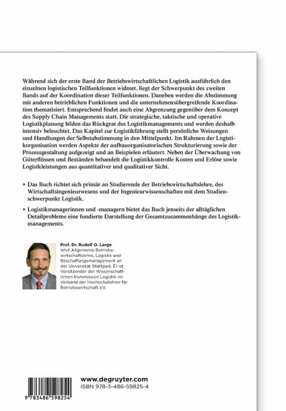 während sich der erste Band der Betriebswirtschaftlichen Logistik ausführlich den einzelnen logistischen Teilfunktionen widmet, liegt der Schwerpunkt des zweiten Bands auf der Koordination dieser Teilfunktionen. Daneben werden die Abstimmung mit anderen betrieblichen Funktionen und die unternehmensübergreifende Koordination thematisiert. Entsprechend findet auch eine Abgrenzung gegenüber dem Konzept des Supply Chain Managements statt. Die strategische, taktische und operative Logistikplanung bilden das Rückgrat des Logistikmanagements und werden deshalb intensiv beleuchtet. Das Kapitel zur Logistikführung stellt persönliche Weisungen und Handlungen der Selbstabstimmung in den Mittelpunkt. Im Rahmen der Logistikorganisation werden Aspekte der aufbauorganisatorischen Strukturierung sowie der Prozessgestaltung aufgezeigt und an Beispielen erläutert. Neben der Überwachung von Güterflüssen und Beständen behandelt die Logistikkontrolle Kosten und Erlöse sowie Logistkleistungen aus quantitativer und qualitativer Sicht.