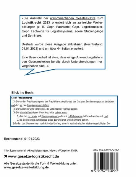 Diese Gesetzessammlung enthält zahlreiche relevante und unkommentierte Gesetzestexte aus dem "Logistikrecht 2023" (Rechtsstand: 01.01.2023), die auch optimal auf die Anforderungen im Rahmen einer Weiterbildung (z. B. Gepr. Fachwirte, Gepr. Logistikmeister, Studiengänge sowie Seminare) abgestimmt sind.Das Buch enthält das Logistikrecht und Transportrecht aus dem Jahr 2023:» Allgemein:- Handelsgesetzbuch (HGB)- Abgabenordnung (AO)- Verordnung (EG) Nr. 593/2008 (Rom I)- BSI-Gesetz (BSIG)- BSI-Kritisverordnung (BSI-KritisV)»» Transportlogistik auf der Straße:- Güterkraftverkehrsgesetz (GüKG)- CMR (Internat. Straßengüterverkehr)- Verordnung (EG) Nr. 1071/2009 (Kraftverkehrsunternehmer)- Verordnung (EG) Nr. 1072/2009 (grenzüberschreitender Güterkraftverkehr)- GüKGrKabotageV (Kabotageverkehr)- Fahrpersonalgesetz (FPersG)- Fahrpersonalverordnung (FPersV)- Verordnung (EG) Nr. 561/2006 (Sozialvorschriften im Straßenverkehr)- Straßenverkehrs-Ordnung (StVO)- Straßenverkehrs-Zulassungs-Ordnung (StVZO)- Straßenverkehrsgesetz (StVG)»» Transportlogistik auf der Schiene:- CIM (Internat. Eisenbahnbeförderung)»» Transportlogistik auf dem Wasser:- Haager Regeln- Einführungsgesetz zum Handelsgesetzbuch (EGHGB)- Binnenschifffahrtsgesetz (BinSchG)- CMNI (Internat. Binnenschifffahrt)»» Transportlogistik in der Luft:- Montrealer Übereinkommen (Internat. Luftverkehr)- Montrealer-Übereinkommen-Durchführungsgesetz (MontÜG)»» Entsorgungslogistik:- Kreislaufwirtschaftsgesetz (KrWG)- Verpackungsgesetz (VerpackG)- Abfallverbringungsgesetz (AbfVerbrG)»» Zoll:- Verordnung (EU) Nr. 952/2013 (Zollkodex der Union)- Durchführungsverordnung (EU) Nr. 2015/2447- TIR-Übereinkommen- Anhang: AEUV (Vertrag über die Arbeitsweise der EU) und EUV (EU-Vertrag)(HINWEIS: Bitte beachten Sie den Rechtsstand 2023 dieser Ausgabe! Wenn eine aktuelle Ausgabe benötigt wird, verwenden Sie die Ausgabe aus dem aktuellen Jahr.)
