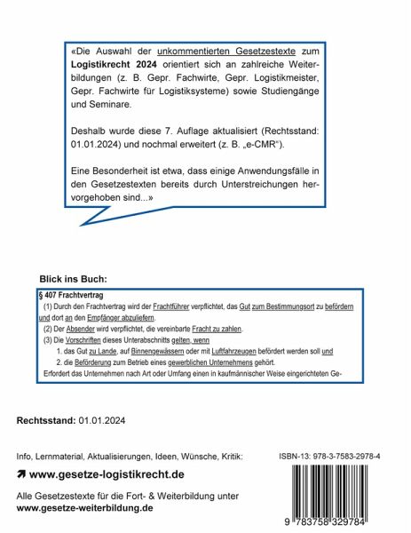Die aktuelle und erweiterte Ausgabe für das Jahr 2024 liegt vor. Diese Gesetzessammlung enthält zahlreiche relevante und unkommentierte Gesetzestexte aus dem "Logistikrecht 2024" (Rechtsstand: 01.01.2024), die auch optimal auf die Anforderungen im Rahmen einer Weiterbildung (z. B. Gepr. Fachwirte, Gepr. Logistikmeister, Studiengänge sowie Seminare) abgestimmt sind. Das Buch enthält das Logistikrecht und Transportrecht aus:» Allgemein:- Handelsgesetzbuch (HGB)- Abgabenordnung (AO)- Verordnung (EG) Nr. 593/2008 (Rom I)- BSI-Gesetz (BSIG)- BSI-Kritisverordnung (BSI-KritisV) »» Transportlogistik auf der Straße:- Güterkraftverkehrsgesetz (GüKG)- CMR (Internat. Straßengüterverkehr) inkl. e-CMR- Verordnung (EG) Nr. 1071/2009 (Kraftverkehrsunternehmer)- Verordnung (EG) Nr. 1072/2009 (grenzüberschreitender Güterkraftverkehr)- GüKGrKabotageV (Kabotageverkehr)- Fahrpersonalgesetz (FPersG)- Fahrpersonalverordnung (FPersV)- Verordnung (EG) Nr. 561/2006 (Sozialvorschriften im Straßenverkehr)- Straßenverkehrs-Ordnung (StVO)- Straßenverkehrs-Zulassungs-Ordnung (StVZO)- Straßenverkehrsgesetz (StVG) »» Transportlogistik auf der Schiene:- CIM (Internat. Eisenbahnbeförderung) »» Transportlogistik auf dem Wasser:- Haager Regeln- Einführungsgesetz zum Handelsgesetzbuch (EGHGB)- Binnenschifffahrtsgesetz (BinSchG)- CMNI (Internat. Binnenschifffahrt) »» Transportlogistik in der Luft:- Montrealer Übereinkommen (Internat. Luftverkehr)- Montrealer-Übereinkommen-Durchführungsgesetz (MontÜG) »» Entsorgungslogistik:- Kreislaufwirtschaftsgesetz (KrWG)- Verpackungsgesetz (VerpackG)- Abfallverbringungsgesetz (AbfVerbrG) »» Zoll:- Verordnung (EU) Nr. 952/2013 (Zollkodex der Union)- Durchführungsverordnung (EU) Nr. 2015/2447- TIR-Übereinkommen- Anhang: AEUV (Vertrag über die Arbeitsweise der EU) und EUV (EU-Vertrag) Eine Besonderheit ist z. B., dass häufige Anwendungsfälle in den Gesetzestexten bereits durch Unterstreichungen hervorgehoben sind. Weitere Informationen zu dieser Gesetzessammlung unter www.gesetze-logistikrecht.de