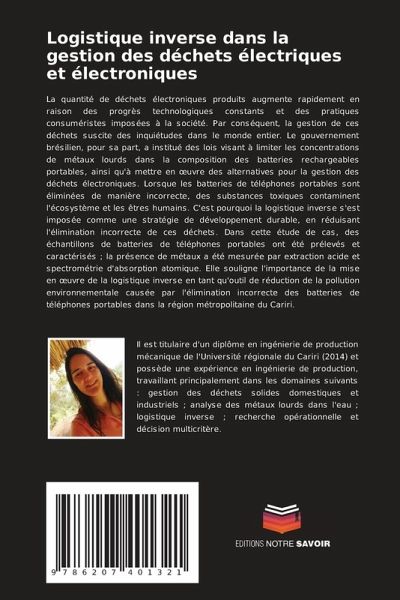 La quantité de déchets électroniques produits augmente rapidement en raison des progrès technologiques constants et des pratiques consuméristes imposées à la société. Par conséquent, la gestion de ces déchets suscite des inquiétudes dans le monde entier. Le gouvernement brésilien, pour sa part, a institué des lois visant à limiter les concentrations de métaux lourds dans la composition des batteries rechargeables portables, ainsi qu'à mettre en oeuvre des alternatives pour la gestion des déchets électroniques. Lorsque les batteries de téléphones portables sont éliminées de manière incorrecte, des substances toxiques contaminent l'écosystème et les êtres humains. C'est pourquoi la logistique inverse s'est imposée comme une stratégie de développement durable, en réduisant l'élimination incorrecte de ces déchets. Dans cette étude de cas, des échantillons de batteries de téléphones portables ont été prélevés et caractérisés ; la présence de métaux a été mesurée par extraction acide et spectrométrie d'absorption atomique. Elle souligne l'importance de la mise en oeuvre de la logistique inverse en tant qu'outil de réduction de la pollution environnementale causée par l'élimination incorrecte des batteries de téléphones portables dans la région métropolitaine du Cariri.