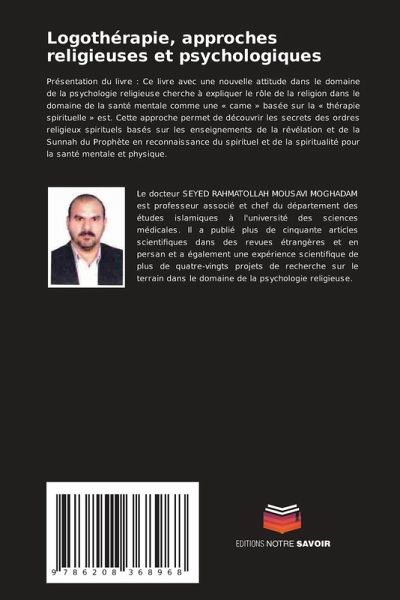 Présentation du livre : Ce livre avec une nouvelle attitude dans le domaine de la psychologie religieuse cherche à expliquer le rôle de la religion dans le domaine de la santé mentale comme une « came » basée sur la « thérapie spirituelle » est. Cette approche permet de découvrir les secrets des ordres religieux spirituels basés sur les enseignements de la révélation et de la Sunnah du Prophète en reconnaissance du spirituel et de la spiritualité pour la santé mentale et physique.