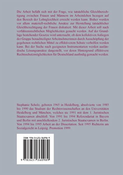 Die Arbeit befaßt sich mit der Frage, wie tatsächliche Gleichberechtigung zwischen Frauen und Männern im Arbeitsleben bezogen auf den Bereich der Lohngleichheit erreicht werden kann. Bisher wurden vor allem materiell-rechtliche Ansätze zur Herstellung tatsächlicher Gleichberechtigung der Frauen diskutiert. Mit dieser Arbeit soll nach verfahrensrechtlichen Möglichkeiten gesucht werden. Auf der Grundlage bestehender Gesetze wird untersucht, ob dem kollektiven Anliegen der Gruppe benachteiligter Arbeitnehmerinnen durch Ausschöpfung der gegebenen rechtlichen Mittel zu effektiverem Schutz verholfen werden kann. Bei der Suche nach geeigneten Instrumentarien werden ausländische Lösungsansätze dargestellt, vor deren Hintergrund effektivere Rechtsschutzmöglichkeiten für Deutschland ausfindig gemacht werden.