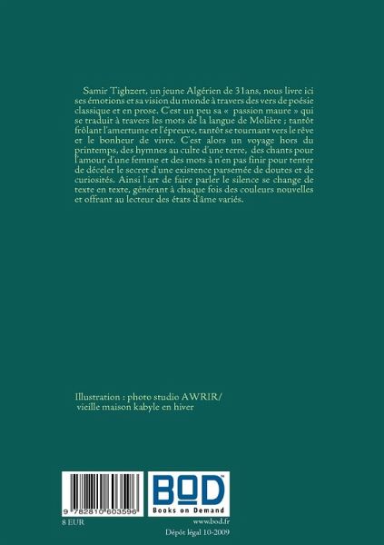 Samir Tighzert, un jeune Algérien de 31ans, nous livre dans ce recueil ses émotions et sa vision du monde à travers des vers de poésie classique et en prose. C'est un peu sa « passion maure » qui se traduit à travers les mots de la langue de Molière ; tantôt frôlant l'amertume et l'épreuve, tantôt se tournant vers le rêve et le bonheur de vivre. C'est alors un voyage hors du printemps, des hymnes au culte d'une terre, des chants pour l'amour d'une femme et des mots à n'en pas finir pour tenter de déceler le secret d'une existence parsemée de doutes et de curiosités. Ainsi l'art de faire parler le silence se change de texte en texte, générant à chaque fois des couleurs nouvelles et offrant au lecteur des états d'âme variés.