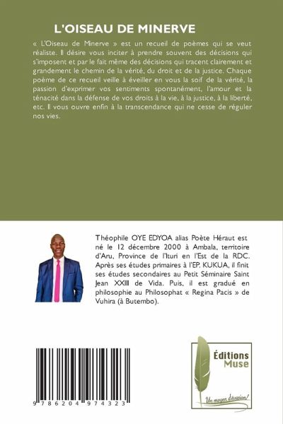 « L'Oiseau de Minerve » est un recueil de poèmes qui se veut réaliste. Il désire vous inciter à prendre souvent des décisions qui s'imposent et par le fait même des décisions qui tracent clairement et grandement le chemin de la vérité, du droit et de la justice. Chaque poème de ce recueil veille à éveiller en vous la soif de la vérité, la passion d'exprimer vos sentiments spontanément, l'amour et la ténacité dans la défense de vos droits à la vie, à la justice, à la liberté, etc. Il vous ouvre enfin à la transcendance qui ne cesse de réguler nos vies.