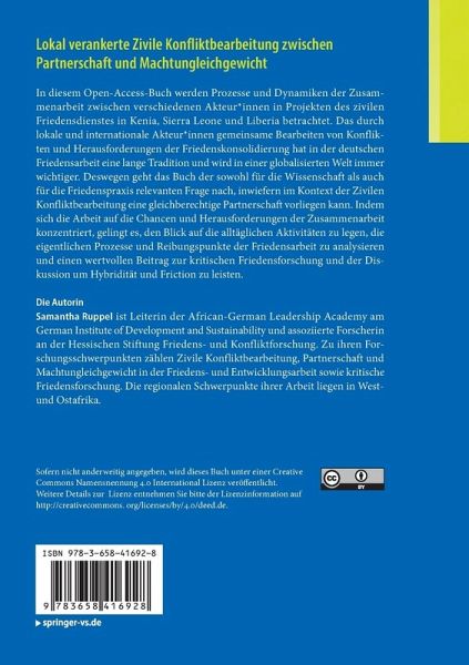 In diesem Open-Access-Buch werden Prozesse und Dynamiken der Zusammenarbeit zwischen verschiedenen Akteur_innen in Projekten des zivilen Friedensdienstes in Kenia, Sierra Leone und Liberia betrachtet. Das durch lokale und internationale Akteur_innen gemeinsame Bearbeiten von Konflikten und Herausforderungen der Friedenskonsolidierung hat in der deutschen Friedensarbeit eine lange Tradition und wird in einer globalisierten Welt immer wichtiger. Deswegen geht das Buch der sowohl für die Wissenschaft als auch für die Friedenspraxis relevanten Frage nach, inwiefern im Kontext der Zivilen Konfliktbearbeitung eine gleichberechtige Partnerschaft vorliegen kann. Indem sich die Arbeit auf die Chancen und Herausforderungen der Zusammenarbeit konzentriert, gelingt es, den Blick auf die alltäglichen Aktivitäten zu legen, die eigentlichen Prozesse und Reibungspunkte der Friedensarbeit zu analysieren und einen wertvollen Beitrag zur kritischen Friedensforschung und der Diskussion um Hybridität und Friction zu leisten.