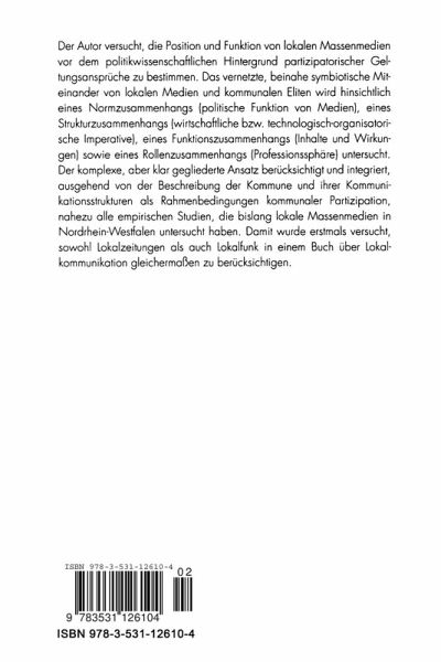 Der Autor bestimmt die Position und Funktion von lokalen Massenmedien vor dem politikwissenschaftlichen Hintergrund partizipatorischer Geltungsansprüche. Das vernetzte, beinahe symbiotische Miteinander von lokalen Medien und kommunalen Eliten wird hinsichtlich eines Normzusammenhangs (politische Funktion von Medien), eines Strukturzusammenhangs (wirtschaftliche bzw. technologisch-organisatorische Imperative), eines Funktionszusammenhangs (Inhalte und Wirkungen) sowie eines Rollenzusammenhangs (Professionssphäre) untersucht.Der komplexe, aber klar gegliederte Ansatz berücksichtigt und integriert, ausgehend von der Beschreibung der Kommune und ihrer Kommunikationsstrukturen als Rahmenbedingungen kommunaler Partizipation, nahezu alle empirischen Studien, die bislang lokale Massenmedien in Nordrhein-Westfalen untersucht haben. Damit wurde erstmals versucht, sowohl Lokalzeitungen als auch Lokalfunk in einem Buch über Lokalkommunikation gleichermaßen zu berücksichtigen.