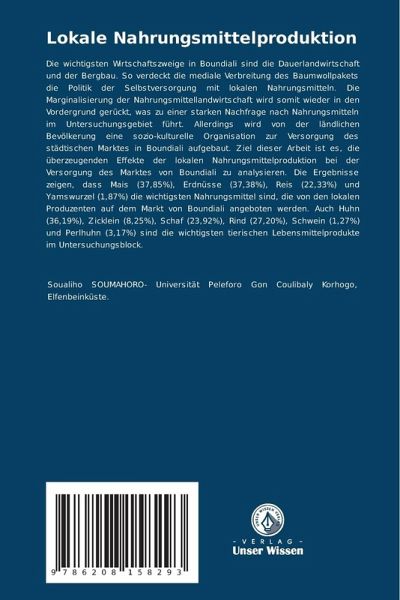 Die wichtigsten Wirtschaftszweige in Boundiali sind die Dauerlandwirtschaft und der Bergbau. So verdeckt die mediale Verbreitung des Baumwollpakets die Politik der Selbstversorgung mit lokalen Nahrungsmitteln. Die Marginalisierung der Nahrungsmittellandwirtschaft wird somit wieder in den Vordergrund gerückt, was zu einer starken Nachfrage nach Nahrungsmitteln im Untersuchungsgebiet führt. Allerdings wird von der ländlichen Bevölkerung eine sozio-kulturelle Organisation zur Versorgung des städtischen Marktes in Boundiali aufgebaut. Ziel dieser Arbeit ist es, die überzeugenden Effekte der lokalen Nahrungsmittelproduktion bei der Versorgung des Marktes von Boundiali zu analysieren. Die Ergebnisse zeigen, dass Mais (37,85%), Erdnüsse (37,38%), Reis (22,33%) und Yamswurzel (1,87%) die wichtigsten Nahrungsmittel sind, die von den lokalen Produzenten auf dem Markt von Boundiali angeboten werden. Auch Huhn (36,19%), Zicklein (8,25%), Schaf (23,92%), Rind (27,20%), Schwein (1,27%) und Perlhuhn (3,17%) sind die wichtigsten tierischen Lebensmittelprodukte im Untersuchungsblock.