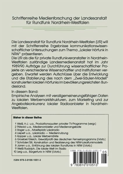 Die nachfolgenden, im Auftrag der Landesanstalt für Rundfunk Nordrhein Westfalen (LtR) durchgeführten Untersuchungen wären ohne das freund liche Entgegenkommen der verantwortlichen Leiter und Mitarbeiter(innen) in den einzelnen lokalen Radiobetrieben nicht durchführbar gewesen. Für Geduld, Hilfsbereitschaft und das fortlaufende Interesse sei daher ausdrücklich gedankt. Die Studie ist im Austausch der Teilprojekte zustandegekommen, die durch die Arbeitsgemeinschaft für Kommunikationsforschung NRW (AfK NRW) im Rahmen ihres Gesamtaufttages abgewickelt wurden. Dabei war entscheidend die Mithilfe eines initiativreichen und motivierten Mitarbei terstabes. Dankbar hervorgehoben sei die Hilfe durch: Andrea Ahlemeyer (Datenauswertung und Statistik), Dipl.-Joumalistin Bettina 1. Feldbaus (Text-Koordination), Maike Telgheder (Recherche und Dokumentation), Dipl.-Joumalist Bemd Weber (Projekt-Koordination). Teile der Feldarbei ten und Vorklärungen der Marketing-Studie wurden durch Dipl.-Kauffrau Marion Kopmann erledigt. Die Endredaktion lag bei Sonja Kratzmair (Satzfertigung) sowie AI brecht Kolthoff (Abnahme). G. G. Kopper Gerd G. Kopper Gesamtzusammenfassung der Studien Zur unternehmerischen Erfolgseinschätzung lokaler Radioanbieter: Analysen der Einnahmeseite -Fallstudien zur Entwicklung der lokalen Werbemärkte und zum Marketing Die strukturbestimmenden Werbeträger des lokalen Werbemarktes: Tageszeitungen und Anzeigenblätter ........................................................ 12 Annahme weiterer lokaler Werbeträger .................................................... 12 Erfolgseinschätzungen .............................................................................. 12 Beschränkung auf lokale Werbung ................................................... 13 Darstellung des Berechnungsverfahrens ........................................... 14 Potentialberechnung des lokalen Werbemarktes ............................... 16 Erfolgseinschätzung aufgrund von Marktausschöpfung .................... 18 Substitutionsannahmen ..................................................................... 20 Verfahren der empirischen Anreicherung von Prognosen .......................... 21 Mögliche methodische Fortentwicklung ................................................... 22 11 Die strukturbestimmenden Werbeträger des lokalen Werbemarktes: Tageszeitungen und Anzeigenblätter Der zentrale Werbeträger des lokalen Werbemarktes ist die Tageszeitung. Sie bestimmt, so läßt sich aufgrund der jetzt vorliegenden Detailuntersu chungen erkennen, in der Regel weit mehr als vier Fünftel des lokalen Wer beumsatzes.