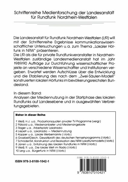 1m Auf trag der Landesanstalt ftir Rundfunk Nordrhein-Westfalen (LfR) in Dfisseldorf hat infas (Institut ftir angewandte Sozialwissenschaft), Bonn-Bad Godesberg, die Mediensituation im Land Nordrhein-Westfalen zum Sende beginn des lokalen Rundfunks im Herbst 1990 erhoben. Diese erste Beob achtung des Medienverhaltens solI Ausgangspunkt zur Bestimmung der ge genwartigen Strukturen und der kfinftigen Veranderungen im Mediennut zungsverhalten sein, die aus der wachsenden Zahl von lokalen Horfunk-und fiberregionalen Fernsehangeboten resultieren. Die vorliegende Untersu chung wurde landesweit und in fiinf ausgewlihlten Kommunikationsraumen durchgefiihrt. Mit dieser Studie liegen Dicht nur Informationen fiber die allgemeine Mediennutzung in verschiedenen Bevolkerungsgruppen Nordrhein-Westfa lens vor, sondern auch fiber die Akzeptanz neuer elektroDischer Medienan gebote, die sich besonders der "Nahwelt" der Nutzer bzw. Rezipienten an nehmen. Die erhobenen Grunddaten konnen schlie8lich als Ausgangsmate rial fUr weitere, auf Verbreitungsgebiete und Regionen bezogene Rezepti onsanalysen dienen. AIle Angaben zur Mediennutzung und zur Horfunkstruktur in Nordrhein Westfalen beziehen sich auf das "alte" Programmschema des WDR-H6r funks. Mit der Einfiihrung des fiinften HOrfunkprogramms erfolgten Ande rungen, die die bestehenden Programme in unterschiedlicher Weise betref fen und Einflu8 auf die weitere Entwicklung der anderen Horfunkprogram me, insbesondere der lokalen Radios, baben konnen.