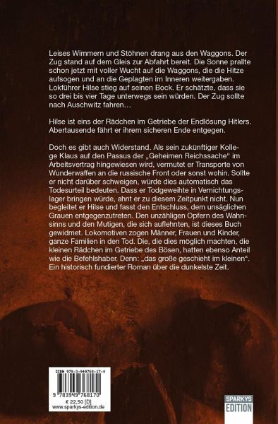 Leises Wimmern und Stöhnen drang aus den Waggons. Der Zug stand auf dem Gleis zur Abfahrt bereit. Die Sonne prallte schon jetzt mit voller Wucht auf die Waggons, die die Hitze aufsogen und an die Geplagten im Inneren weitergaben. Lokführer Hilse stieg auf seinen Bock. Er schätzte, dass sie so drei bis vier Tage unterwegs sein würden. Der Zug sollte nach Auschwitz fahren ... Hilse ist eins der Rädchen im Getriebe der Endlösung Hitlers. Abertausende fährt er ihrem sicheren Ende entgegen. Doch es gibt auch Widerstand. Als sein zukünftiger Kollege Klaus auf den Passus der "Geheimen Reichssache" im Arbeitsvertrag hingewiesen wird, vermutet er Transporte von Wunderwaffen an die russische Front oder sonst wohin. Sollte er nicht darüber schweigen, würde dies automatisch das Todesurteil bedeuten. Dass er Todgeweihte in Vernichtungslager bringen würde, ahnt er zu diesem Zeitpunkt nicht. Nun begleitet er Hilse und fasst den Entschluss, dem unsäglichen Grauen entgegenzutreten. Den unzähligenOpfern des Wahnsinns und den Mutigen, die sich auflehnten, ist dieses Buch gewidmet. Lokomotiven zogen Männer, Frauen und Kinder, ganze Familien in den Tod. Die, die dies möglich machten, die kleinen Rädchen im Getriebe des Bösen, hatten ebenso Anteil wie die Befehlshaber. Denn: "das große geschieht im kleinen". Ein historisch fundierter Roman über die dunkelste Zeit.