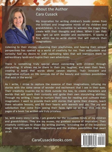 I am an author with a heartwarming touch and a creative spirit! I find inspiration in the imaginative ideas of my 9 children and 10 grandchildren. With a deep passion for storytelling and a love for nurturing young minds, I weave enchanting tales that captivate the hearts of children and adults alike.Drawing from my diverse background and experiences, I bring a unique blend of warmth, wisdom, and whimsy to my children's books. Each story is crafted with love and care, inspired by the remarkable adventures and innocent dreams of my own family. From magical forests to playful farmyard animals, my vivid imagination transports young readers to delightful worlds filled with joy, laughter, and valuable life lessons.With a flair for engaging storytelling and relatable characters, my books foster a love for reading and imagination. Through my captivating narratives, I encourage children to embrace their own creativity and appreciate the beauty of nature, family, and embrace differences.Step into a world of wonder and imagination with my enchanting stories, where the inspiration of my cherished loved ones blends seamlessly with my role as an author. Each page is a testament to the boundless imagination and infinite possibilities that reside in the hearts of children. Embark on a magical journey today and discover the extraordinary tales penned by me, Cara Cusack, with help from my family.My inspiration for writing children's books comes from the brilliant and imaginative minds of my children and grandchildren. Witnessing the magic they create with their thoughts and ideas is incredible. When I see their eyes light up with wonder and excitement, it sparks a fire within me to write stories that will capture their imaginations.Listening to their stories, observing their playfulness, and hearing their unique perspectives have opened up a world of creativity for me. Their enthusiasm and curiosity fuel my desire to craft captivating tales that will transport them to extraordinary lands and inspire their own adventures.There is something truly special about connecting with children through storytelling. It allows me to share in their joy, laughter, and even their fears, creating a bond that words alone cannot express. Their innocent and imaginative outlook on life reminds me of the beauty and limitless possibilities that exist in the world.As I write, I strive to capture the essence of their imaginations, infusing my stories with the same sense of wonder and excitement that I see in their eyes. Their creativity inspires me to think outside the box, to create characters and worlds that will spark their curiosity and ignite their own storytelling abilities.Through my writing, I hope to nurture their love for reading and cultivate their imagination. I want to provide them with stories that ignite their dreams, teach them valuable lessons, and fill their hearts with warmth and joy. The joy and satisfaction that come from seeing their faces light up as they dive into the pages of a book I've written are truly priceless.So, with every story I write, I am grateful for the incredible minds of my children and grandchildren. They are my muses, my greatest source of inspiration. Their creativity continues to shape my writing journey, reminding me of the boundless magic that lies within their imaginations and the endless possibilities that await us all.