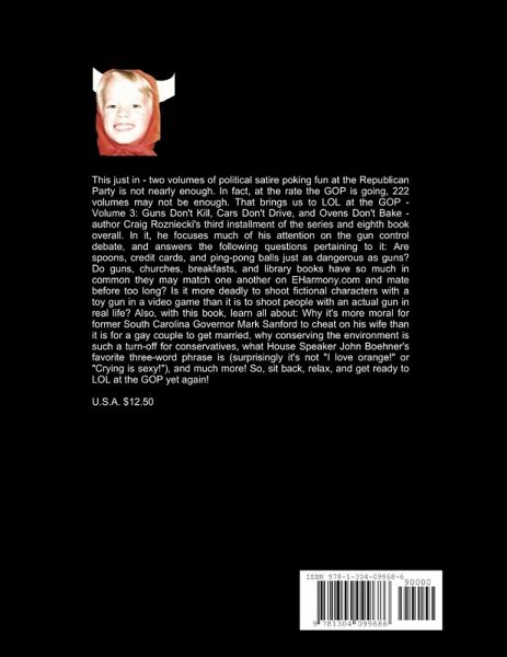 This just in - two volumes of political satire poking fun at the Republican Party is not nearly enough. At the rate the GOP is going, 222 volumes may not be enough. That brings us to LOL at the GOP - Volume 3: Guns Don't Kill, Cars Don't Drive, and Ovens Don't Bake. In it, author Craig Rozniecki answers the following questions: Are spoons, credit cards, & ping-pong balls as dangerous as guns? Do guns, churches, breakfasts, & library books have so much in common they may match one another on EHarmony.com? Is it more deadly to shoot fictional characters with a toy gun in a video game than it is to shoot people with an actual gun in real life? Also, with this book, learn all about: Why it's more moral for former South Carolina Governor Mark Sanford to cheat on his wife than it is for a gay couple to get married, why conserving the environment is such a turn-off for conservatives, & what House Speaker John Boehner's favorite three-word phrase is (surprisingly it's not "I love orange!" or "Crying is sexy!").