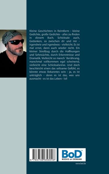 Kleine Geschichten in Reimform - kleine Gedichte, große Gedichte - alles zu finden in diesem Buch. Schicksale auch, Gedanken, so zwischen dir und mir - irgendwie und irgendwas - vielleicht. Es ist mal ernst, dann auch wieder nicht. Ein kleiner Streifzug durch die Hoffnungen und Sehnsüchte, durch Erkenntnisse und Dramatik. Vielleicht so manch´ Berührung, manchmal vollkommen egal scheinend, vielleicht eine Schicksalsreise. Und doch beschleicht einen das seltsame Gefühl, es könnte etwas Bekanntes sein - ja, es ist untrüglich - denn es ist das, was uns ausmacht - es ist das Leben - lol!