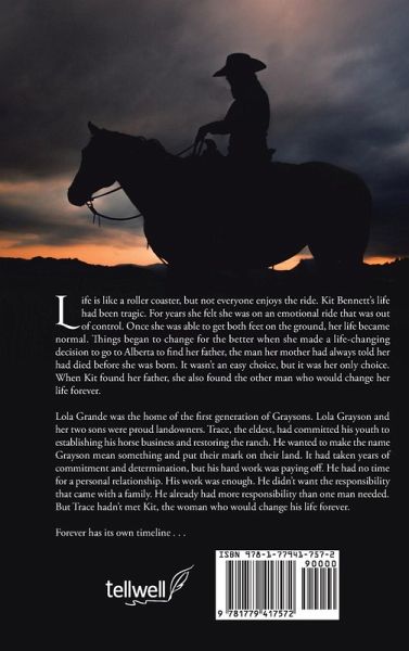 Life is like a roller coaster, but not everyone enjoys the ride. Kit Bennett's life had been tragic. For years she felt she was on an emotional ride that was out of control. Once she was able to get both feet on the ground, her life became normal. Things began to change for the better when she made a life-changing decision to go to Alberta to find her father, the man her mother had always told her had died before she was born. It wasn't an easy choice, but it was her only choice. When Kit found her father, she also found the other man who would change her life forever.Lola Grande was the home of the first generation of Graysons. Lola Grayson and her two sons were proud landowners. Trace, the eldest, had committed his youth to establishing his horse business and restoring the ranch. He wanted to make the name Grayson mean something and put their mark on their land. It had taken years of commitment and determination, but his hard work was paying off. He had no time for a personal relationship. His work was enough. He didn't want the responsibility that came with a family. He already had more responsibility than one man needed. But Trace hadn't met Kit, the woman who would change his life forever. Forever has its own timeline...