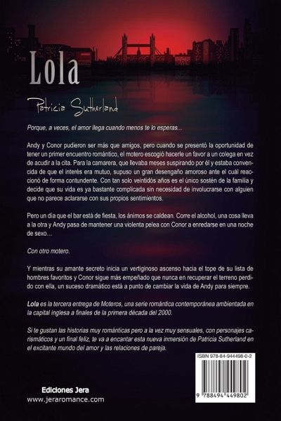 Porque, a veces, el amor llega cuando menos te lo esperas... Andy y Conor pudieron ser más que amigos, pero cuando se presentó la oportunidad de tener un primer encuentro romántico, el motero escogió hacerle un favor a un colega en vez de acudir a la cita. Para la camarera, que llevaba meses suspirando por él y estaba convencida de que el interés era mutuo, supuso un gran desengaño amoroso ante el cuál reaccionó de forma contundente. Con tan solo veintidós años es el único sostén de la familia y decide que su vida es ya bastante complicada sin necesidad de involucrarse con alguien que no parece aclararse con sus propios sentimientos. Pero un día que el bar está de fiesta, los ánimos se caldean. Corre el alcohol, una cosa lleva a la otra y Andy pasa de mantener una violenta pelea con Conor a enredarse en una noche de sexo… Con otro motero. Y mientras su amante secreto inicia un vertiginoso ascenso hacia el tope de su lista de hombres favoritos y Conor sigue más empeñado que nunca en recuperar el terreno perdido con ella, un suceso dramático está a punto de cambiar la vida de Andy para siempre. Lola es la tercera entrega de Moteros, una serie romántica contemporánea ambientada en la capital inglesa a finales de la primera década del 2000. Si te gustan las historias muy románticas pero a la vez muy sensuales, con personajes carismáticos y un final feliz, te va a encantar esta nueva inmersión de Patricia Sutherland en el excitante mundo del amor y las relaciones de pareja.