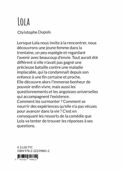 Lorsque Lola nous invite à la rencontrer, nous découvrons une jeune femme dans la trentaine, un peu espiègle et regardant l'avenir avec beaucoup d'envie. Tout aurait été différent si elle n'avait pas gagné une précieuse bataille contre une maladie implacable depuis son enfance, qui la condamnait à une fin certaine et proche. Elle découvre alors l'immense bonheur de pouvoir enfin vivre, mais aussi les questionnements et les angoisses universelles qui accompagnent l'existence.Comment les surmonter ? Comment se nourrir des expériences qu'elle n'a pas vécues pour avancer dans la vie ? C'est en convoquant les ressorts de la comédie que Lola va tenter de trouver les réponses à ses questions