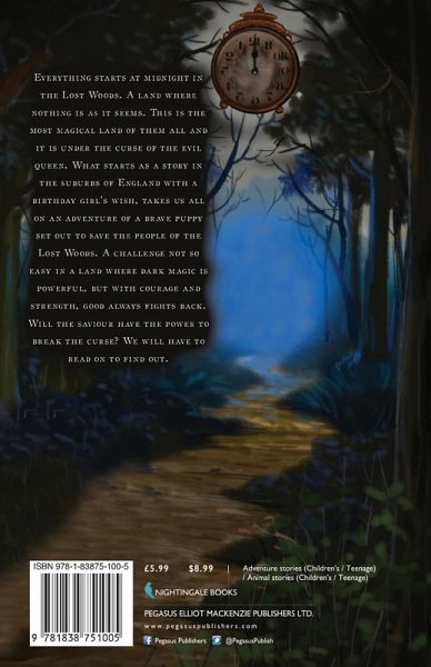 Everything starts at midnight in the Lost Woods. A land where nothing is as it seems. This is the most magical land of them all and it is under the curse of the evil queen. What starts as a story in the suburbs of England with a birthday girl's wish, takes us all on an adventure of a brave puppy set out to save the people of the Lost Woods. A challenge not so easy in a land where dark magic is powerful, but with courage and strength, good always fights back. Will the saviour have the power to break the curse? We will have to read on to find out.