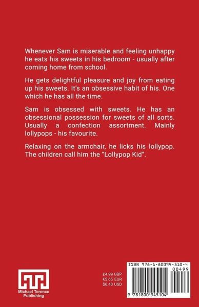 Whenever Sam is miserable and feeling unhappy he eats his sweets in his bedroom - usually after coming home from school. He gets delightful pleasure and joy from eating up his sweets. It's an obsessive habit of his. One which he has all the time. Sam is obsessed with sweets. He has an obsessional possession for sweets of all sorts. Usually a confection assortment. Mainly lollypops - his favourite. Relaxing on the armchair, he licks his lollypop. The children call him the "Lollypop Kid".