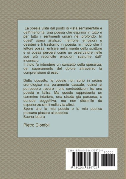 Libro di poesia focalizzato sulle emozioni, i sentimenti provati da un ragazzo. Il libro, con un linguaggio semplice vuole imprimere nel lettore emozioni e stati d'animo provati nella lettura e soprattutto invitarlo al piacere di una lettura semplice ma profonda, e con pochi artifici letterari, ma in grado di imprimersi nell'animo umano e portare un'atmosfera quasi onirica, che sarà quella che pervaderà la maggior parte dei componimenti. I componimenti non sono né in ordine cronologico, né per caratteristiche precise o divisioni tematiche, dunque invito a leggerle così per come sono situate e soprattutto da leggere in modo lento e profondo, perché altrimenti se ne perde il sapore e la profondità. Buona lettura