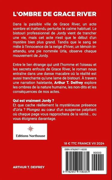 L'estuaire de Grace River s'écoule placidement au pied de la petite ville de Warstreet. Derrière ce calme apparent, que se cache-t-il ? Dans ce drame à suspense captivant, Arthur T. Deifrey nous plonge au coeur d'une petite ville qui n'est pas aussi paisible qu'elle en a l'air. Grace River, tel un miroir aux reflets trompeurs, dissimule des secrets aussi profonds que ses eaux calmes. Lorsqu'un acte sanglant vient briser la quiétude hivernale, c'est tout l'équilibre de la communauté qui bascule. Au centre de ce mystère, un homme nommé Jordy. Qui est cet homme ? Pourquoi son bistouri, instrument de guérison, est-il devenu une arme mortelle. Mais Jordy n'est pas le seul à garder des secrets. Une pie nommée Urla semble le suivre comme son ombre. Simple oiseau ou messagère d'un destin funeste ? Son regard perçant semble scruter les âmes, comme si elle détenait la clé d'une énigme plus vaste encore. Ce roman à suspense vous entraînera dans un labyrinthe d'énigmes où chaque réponse soulève de nouvelles questions. Pourquoi les habitants de Grace River semblent-ils si prompts à enterrer leurs morts... et leurs vérités ? Quel lien mystérieux unit Jordy et Urla ? Et surtout, jusqu'où iront-ils pour protéger leurs secrets ? A travers une narration haletante, l'auteur tisse une toile complexe où le mystère se niche dans les moindres recoins. Telle une danse macabre, l'histoire vous emportera dans un tourbillon d'émotions, où la frontière entre le bien et le mal s'estompe comme la brume sur la rivière. Ce drame psychologique explore les zones d'ombre de l'âme humaine, là où se terrent nos plus sombres instincts. Dans un style à la fois élégant et percutant, Arthur T. Deifrey nous rappelle que les apparences sont souvent trompeuses, et que la vérité peut être aussi tranchante qu'une lame de rasoir. Préparez-vous à plonger dans les eaux troubles de Grace River. Mais prenez garde: une fois que vous aurez commencé votre lecture, vous ne pourrez plus faire marche arrière. Car dans ce roman à suspense, chaque page vous rapprochera inexorablement de la vérité... à moins qu'elle ne vous en éloigne davantage.